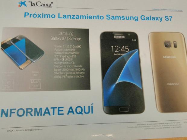 Poster quảng cáo từ một ngân hàng Tây Ban Nha đối tác của Samsung Trong tập tiếp theo về 'sự rò rỉ' của Galaxy S7 và S7 Edge (cách gọi hài hước), mình sẽ mang lại cho bạn một sự xác nhận mới về các thông số kĩ thuật đầy đủ đến từ một ngân hàng của Tây Ban Nha - La Caixa. Đây là ngân hàng được cho là đang hợp tác với Samsung trong một chiến dịch mà hãng điện thoại Hàn lại chính là người phải trả tiền - điều này các bạn có thể thấy thông qua tấm poster nội bộ dưới đây bị rò rỉ ra ngoài. Mình cũng có thử kiểm tra website của ngân hàng La Caixa, và tìm kiếm các thông tin cho Galaxy S7. Bất ngờ là thông qua liên kết ' tại đây ' thấy rõ các cụm từ 'Galaxy S7' được đề cập trong một vài đoạn mã, vì vậy sự tồn tại tấm poster nói trên có thể được xác nhận một phần (trong liên hết các bạn ấn Ctrl + F và đánh chữ S7 rồi Enter là thấy nhé).