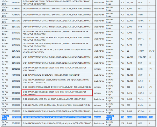 Camera Galaxy S7 sẽ thẩm mỹ hơn người tiền nhiệm Trước đây, chúng ta mới chỉ biết đến đó là việc Samsung sẽ hạ độ phân giải của camera chính xuống còn 12MP (trên dòng S6 Series là 16MP) nhưng chi tiết hơn thì chưa ai rõ. Mới đây, các thông tin liên quan đến camera Galaxy S7 đã lộ diện rõ ràng hơn thông qua một số tài liệu xuất nhập khẩu của Zauba (một đơn vị của Ấn độ nhập thiết bị cho Samsung R&D thử nghiệm). Các thiết bị được đề cập ở đây đó là SM-G930F - được cho là bản quốc tế của Galaxy S7 và nó được nhập từ Việt Nam (hình ảnh).