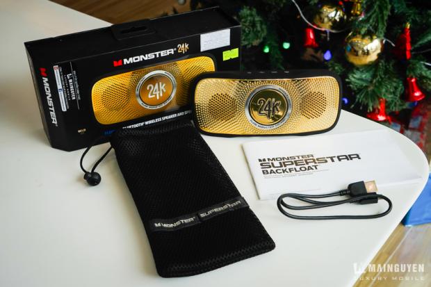 Hộp đựng sản phẩm và các phụ kiện kèm theo. Khi mua Monster SuperStar BackFloat, khách hàng được tặng kèm dây sạc micro USB và túi đựng loa.
