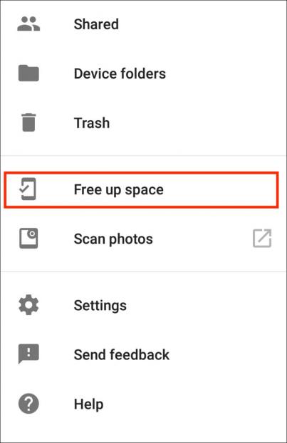 Đầu tiên, mở ứng dựng Google Photos và và vuốt từ mép màn hình xuống để mở menu tùy chọn. Kéo xuống bạn sẽ thấy dòng Free up space.