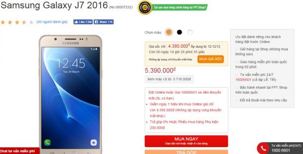 Theo đó, tại , khi bạn đặt mua online mẫu smartphone Galaxy J7 2016, giá bán sẽ giảm từ 5.39 triệu xuống chỉ còn 4.39 triệu đồng, giảm 1 triệu đồng, mức giá quá tốt cho mẫu smartphone tầm trung này.