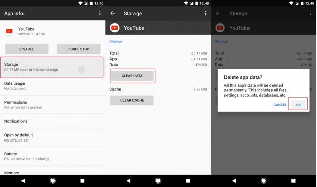 - Sau khi hoàn tất quá trình cài đặt, các bạn truy cập tiếp vào phần Cài đặt - Ứng dụng - YouTube. Ở mục lưu trữ nhấn 'Xóa dữ liệu' sau đó nhấn OK.