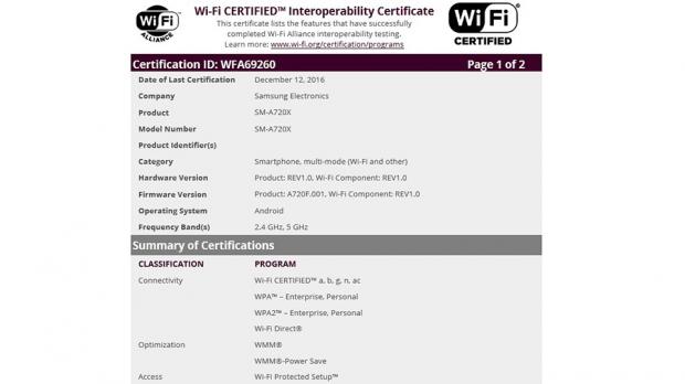 Samsung Galaxy A7 2017 đã nhận được chứng nhận Bluetooth vào tháng trước và chứng nhận của FCC hồi đầu tháng này. Hôm nay nó tiếp tục nhận được chứng chỉ Wi-Fi Certificate từ liên minh Wi-Fi. Với việc nhận được cả 2 chứng chỉ Bluetooth và Wi-Fi Certificate thì nhiều khả năng Galaxy A7 2017 sẽ được công bố trong thời gian rất sớm. Tên mã được ghi nhận là SM-A720X trong khi SM-A720F nhiều khả năng là phiên bản quốc tế của smartphone Samsung này. Cách đây không lâu, Galaxy A7 2017 cũng từng được phát hiện trong dữ liệu nhập khẩu trên Zauba vào Ấn độ để thực hiện các quá trình thử nghiệm.