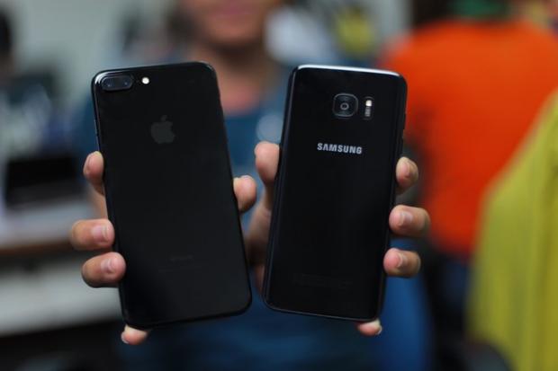 Samsung Galaxy S7 edge Black Pearl đọ dáng với iPhone 7 Plus màu Jet Black.