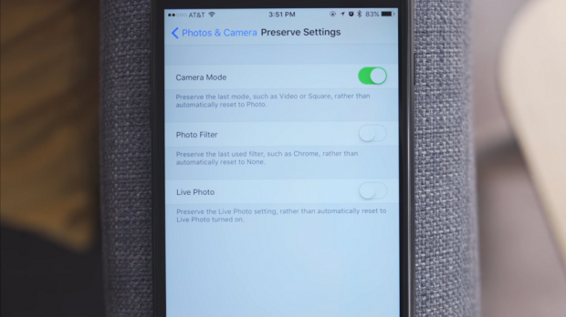 Với thiết lập Preserve Settings mới được bổ sung vào ứng dụng Camera trên iOS 10.2, người dùng có thể thay đổi thiết lập mặt định của ứng dụng này. Theo đó, bạn có thể chuyển từ chế độ Photo truyền thống sang quay video hoặc chụp ảnh góc rộng tùy thích (điều này tùy thuộc vào chế độ cuối cùng mà bạn chọn trước kho thoát ra). Tuy nhiên, bạn cần lưu ý là sau khi thoát ứng dụng (và sau một thời gian đủ lâu), chế độ Photo lại hiện ra khi ứng dụng Camera được mở lại.