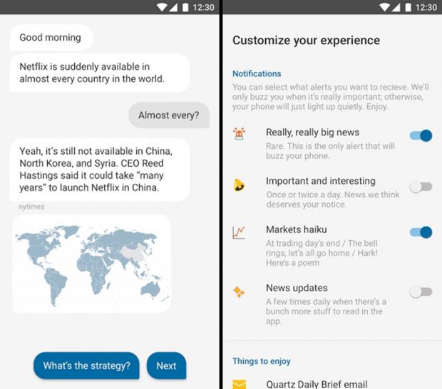 Quartz là một ứng dụng tin tức tuyệt vời. Nó đem tới hàng loạt các chủ đề nóng hoặc thú vị đang hot nhất trên thị trường hiện nay nhưng được diễn tả dưới dạng một cuốc trò chuyện, nhắn tin về tin tức. Ứng dụng sẽ trả về các kết quả bằng tin nhắn, hình ảnh, GIF và các liên kết...