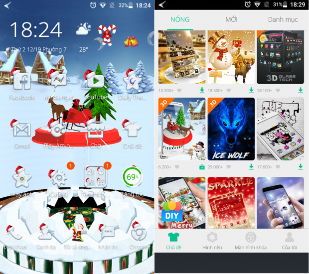 Đầu tiên bạn cần tải trước CM Launcher và chọn làm làm Launcher mặc định. Để thiết lập những bộ icon ngộ nghĩnh bạn truy cập vào mục chủ đề trong đây các CM Laucher sẽ có các bộ chủ đề theo không khí Noel, bạn lựa chọn bộ chủ đề yêu thích tải về cài đặt nó miễn phí.