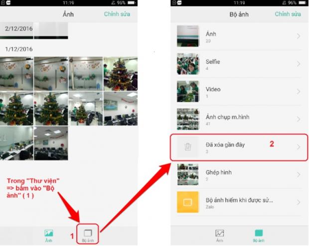 - Mở thư viện ảnh > Bộ ảnh > Đã xóa gần đây > Chỉnh sửa > Phục hồi.