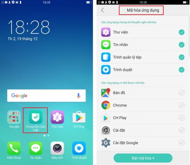 - Trung tâm bảo mật > Quyền bảo mật > Mã hóa ứng dụng > Chọn ứng dụng cần mã hóa > Đặt mật khẩu.