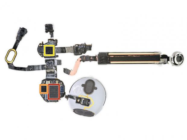Toàn bộ linh kiện sau khi tháo tai nghe AirPods. Khu vực màu đỏ được cho là con chip chính quản lý các tác vụ kết nối không dây