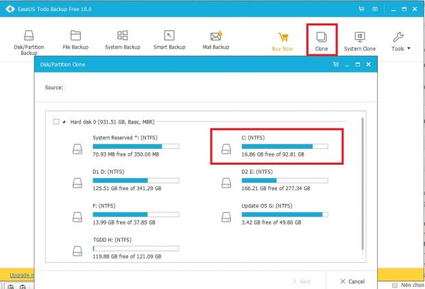 Bước 4: Sau khi cài đặt xong bạn khởi động ứng dụng > Tại giao diện chính bạn nhấn vào 'Clone' và tiến hành chọn ổ đĩa chứa hệ điều hành (thông thường ổ C) > Nhấn Next để đi đến bước kế tiếp.