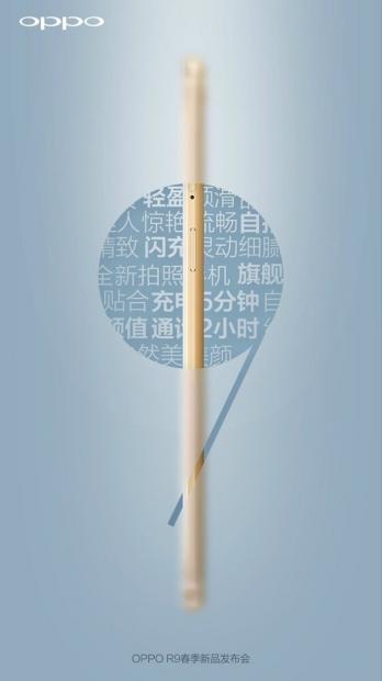 Theo thông tin từ trang gizchina.com, một tấm hình vừa được OPPO tung ra đã cho thấy được những nét khái quát về thiết kế của R9, và thật sự thì kiểu thiết này cũng nằm trong dự đoán của khá nhiều người. OPPO R9 sẽ có vỏ nhôm nguyên khối, trong hình thì lớp vỏ này màu vàng nhưng có lẽ sẽ có màu khác nữa. Màn hình của sản phẩm trong bức hình có màu trắng. Nút nguồn được đặt gần như ngay trung tâm cạnh bên phải, phí trên đó một chút là khay để sim.