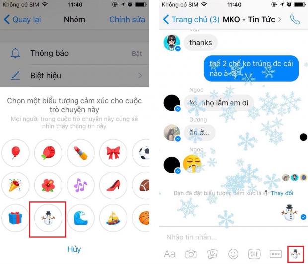 Bước 2: Sau khi kích hoạt xong tại khung trò chuyện bạn sẽ thấy biểu tượng người tuyết, đây chính là sự thay thế của nút 'Like' trong mùa giáng sinh này. Khi kích vào tuyết sẽ rơi!