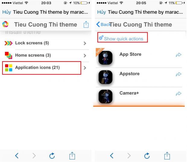 Bước 1: Mở trình duyệt Safari > Sau đó nhấp vào đây để mở trang Download Skin > Chọn vào 'Application icons' > Chọn vào dòng 'Show quick actions'.