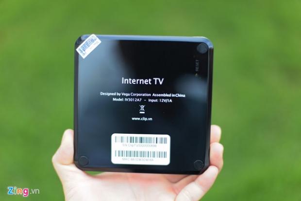 Mặt lưng có 4 đế cao su giúp bám bề mặt tốt hơn. Clip TV Box được sản xuất bởi Vega (công ty cổ phần Bạch Minh). Model này dùng nguồn điện 12V/1A. Đèn báo hiệu Reset nằm ở góc phải.