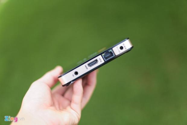 Cạnh bên là cổng AV, HDMI, mạng LAN RJ45 và cổng sạc. Người dùng có thể kết nối thông qua mạng dây hoặc Wi-Fi.
