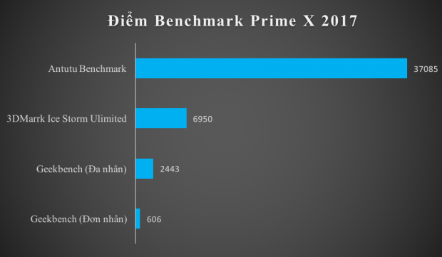 Điểm hiệu năng đo được bằng phần mềm Antutu Benchmark (đánh giá hiệu năng tổng thể), Geekbench 4.0 (đánh giá hiệu năng CPU) và 3D Mark Ice Storm Ulimited (đánh giá hiệu năng xử lý đồ hoạ của GPU) được thể hiện trong bảng dưới đây.
