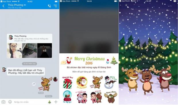 Khi bạn chọn một sticker nào đó để gửi đi thì sẽ xuất hiện ngay một đoạn video ngắn cực kì vui nhộn với hình ảnh âm thanh đặc trưng ngày lễ Noel. Ví dụ như chú tuần lộc bỏ mặc ông già Noel đi quẩy tưng bừng cùng đồng bọn, hay có một Sticker đại diện cho những người FA phải ở nhà trong đợt lễ Noel này. Tất cả tạo nên một bộ Sticker cực kì ý nghĩa mà không kém phần vui nhộn.