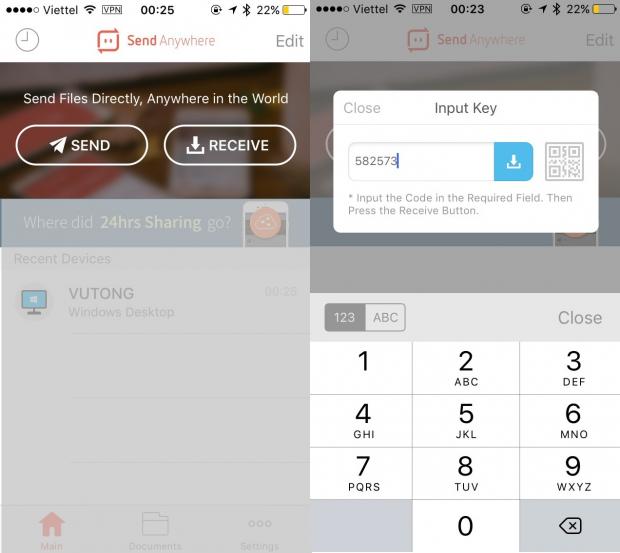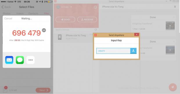 Đối với điện thoại lúc này, bạn hãy chọn tùy chọn Nhận Receive. Bạn có thể tùy chọn nhận mã thông qua nhập mã code hoặc quét mã QR được hiển thị trên màn hình máy tính.