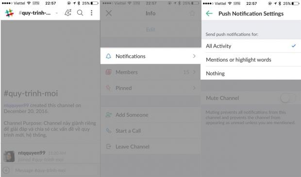 Để truy cập thiết lập, mở channel mà bạn muốn tùy chỉnh chức năng thông báo, sau đó click chọn tên Channel ở góc trên cùng màn hình, rồi chọn Notifications, sau đó thay đổi cách nhận thông báo theo nhu cầu.