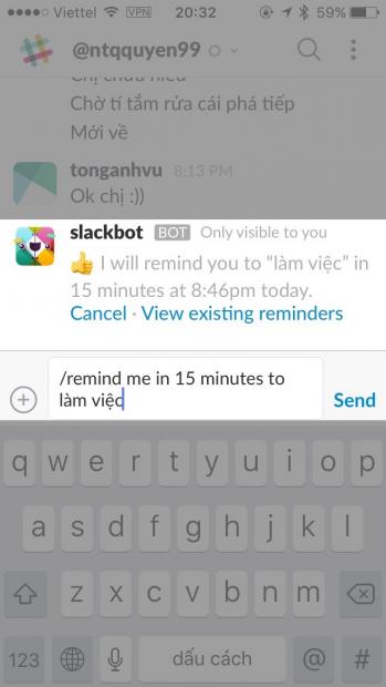Đúng là một ứng dụng hỗ trợ thực hiện công việc, Slack cho phép bạn thực hiện thiết lập các nhắc nhở. Chỉ cần bạn nhập theo cú pháp sau: /Remind [@Người_Muốn_Nhắc_Nhở hoặc #Channel] in [Khi nào] to [Hoạt động].