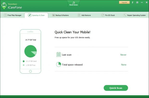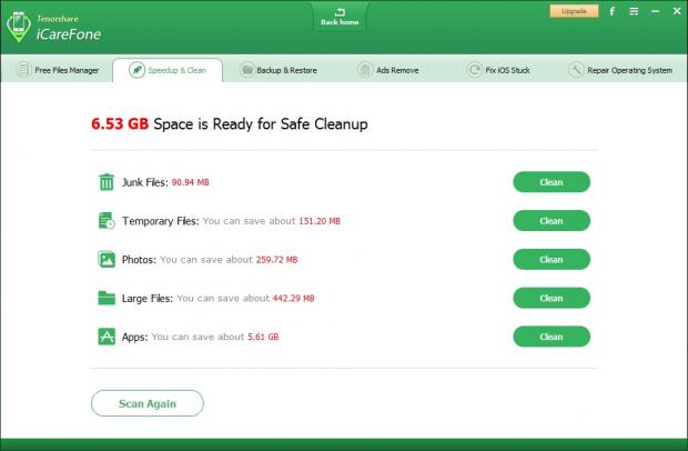 Ở đây mình thử tính năng dọn dẹp rác và tăng tốc cho iPhone nên nhấn vào 'Speedup & Clean'.