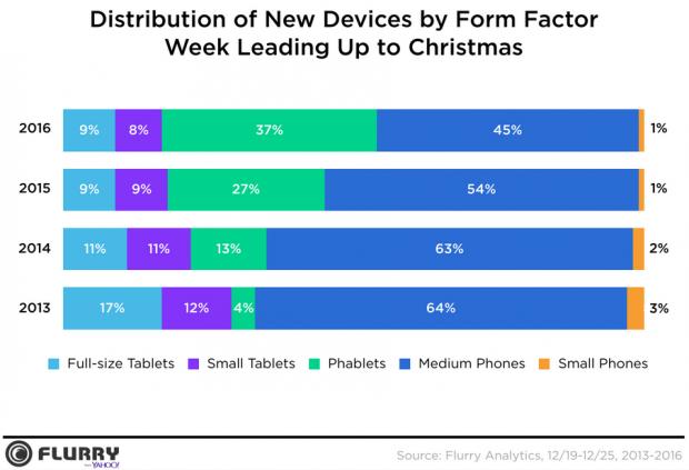 Cũng trong mùa mua sắm này, phablet (màn hình từ 5 – 6.9 inch) chiếm 37% số lượng smartphone được bán ra, trong khi năm ngoái con số này là 27%, năm 2014 là 13% và 2013 chỉ 4%. Điều này cho thấy xu hướng lựa chọn của người tiêu dùng là những smartphone màn hình lớn.