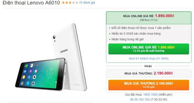 Theo đó, nếu bạn không đòi hỏi quá cao về ngoại hình mà chỉ quan trọng về tính năng bên trong thì Lenovo A6010 là một lựa chọn tốt trong tầm giá 2 triệu đồng, đặc biệt, hiện máy đang được giảm giá chỉ còn 1.89 triệu đồng, lưu ý là khuyến mãi giảm giá này chỉ áp dụng đến ngày 31/12 thôi nhé.