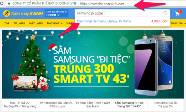 Truy cập trang dienmayxanh.com. Nhập tên điện thoại vào khung tìm kiếm.