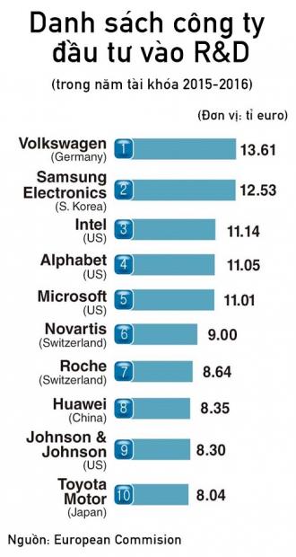 Theo Android Authority, Samsung đã dùng đến 12,53 tỉ euro (khoảng 13 tỉ USD) vào năm tài khóa 2015-2016 vừa qua cho các hoạt động R&D, chỉ đứng sau hãng xe Volkswagen Group.