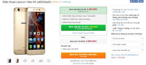 Cụ thể, Lenovo Vibe K5 đang được hạ giá từ 2.99 triệu đồng xuống còn 2.39 triệu đồng trong chương trình mua online giá rẻ (áp dụng đến ngày 31/12). Mức giá này được xem là rất phải chăng và hấp dẫn bởi máy không chỉ có thiết kế cao cấp mà còn sở hữu cấu hình khá tốt.