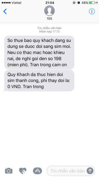 Mình có thắc mắc là “thế SIM đang trong máy thì thế nào?” thì được nhân viên trả lời rằng “anh có thể bỏ đi ạ”. Và cũng chỉ ít giây sau, SIM cũ trong máy sẽ nhận được tin nhắn là bạn đã đổi SIM thành công. Lưu ý với các bạn là hãy lưu số ra máy nếu như số liên lạc chủ yếu lưu trên SIM (nhân viên Viettel cũng sẽ nhắc bạn điều này), tất cả các tài khoản chính hay khuyến mãi, các gói cước... vẫn được giữ như SIM cũ nhé.