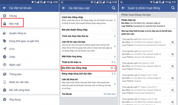 Tới đây bạn có thể xem tất cả các phiên truy cập vào tài khoản Facebook, ứng dụng sẽ thống kế ra thời gian truy cập lần cuối, địa điểm và loại thiết bị. Nếu bạn phát hiện ra những truy cập bất thường thì đã có người truy cập vào trái phép vào Facebook của bạn.