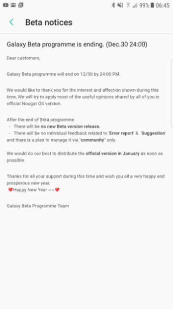 Sammy cũng thông báo rằng chương trình thử nghiệm Android Nougat cho Galaxy S7 và S7 Edge sẽ kết thúc vào hôm nay (30/12). Điều này cũng đồng nghĩa với việc sẽ không có phiên bản beta nào được phát hành nữa.