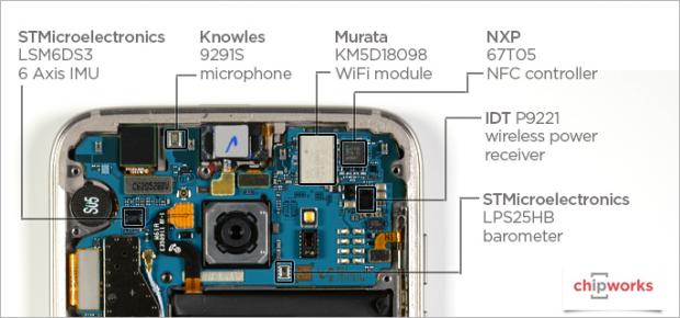 Hình ảnh trên cho thấy Galaxy S7 edge dùng chip Wi-Fi của Mutara, chip NFC của NXP, cảm biến con quay hồi chuyển và khí áp của STMicroelectronics.