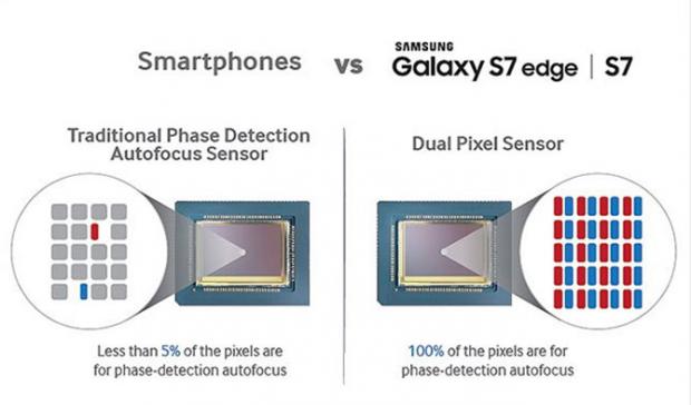 Về cơ bản, công nghệ này tương tự kỹ thuật lấy nét theo pha nhưng số lượng điểm lấy nét tăng lên. Công nghệ Dual Pixel trên Samsung Galaxy S7 và S7 Edge cho phép 100% các điểm ảnh trên cảm biến đều có thể lấy nét, nhiều hơn gấp bội so với con số 5% điểm ảnh trên cảm biến có thể lấy nét của công nghệ truyền thống giúp cho việc lấy nét chính xác và nhanh hơn.