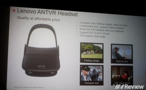 Trong đó, ANT VR là thiết bị thực tế ảo (VR) được hỗ trợ bởi công nghệ Lenovo VR, thiết bị này sở hữu thiết kế gập lại được giúp dễ dàng mang theo với trọng lượng chỉ 160g. ANT VR là giải pháp thực tế ảo giá rẻ hoạt động tương tự Gear VR của Samsung, chiếc kính này tận dụng một smartphone để phát nội dung VR. Theo đó, công nghệ Lenovo VR hiện mới chỉ tích hợp sẵn trên 3 mẫu điện thoại A7010, VIBE X3 và VIBE K5 Plus, đây cũng là những mẫu điện thoại được tích hợp sẵn công nghệ âm thanh Dolby ATMOS.