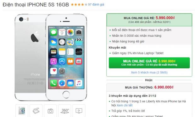 Theo đó, từ bây giờ đến ngày 2/1, iPhone 5s được giảm giá sốc từ 6.99 triệu xuống còn 5.99 triệu đồng, giảm 1 triệu đồng. Mức giá tốt cho những ai muốn sở hữu một iPhone chính hãng mới tinh, gọn gàng và lịch lãm. Lưu ý thêm là số lượng có hạn nhé vì vậy bạn phải nhanh tay lên.