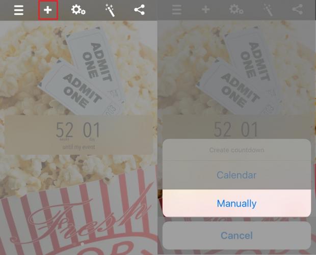 Đầu tiên để tạo một sự kiện đếm ngược cho năm mới hay một dịp nào đó, bạn nhấp vào dấu + ở phía trên cùng. Sau đó chọn tùy chọn Manually.