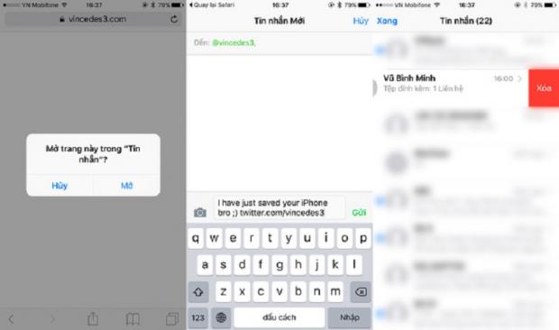 Ứng dụng nhắn tin bị treo sau khi bấm vào tệp tin được gửi qua.Để có thể 'cứu' thiết bị của bạn khỏi tình trạng này, thì hãy theo đường link tại đây bằng ứng dụng Safari. Lúc này một cửa sổ soạn tin nhắn sẽ hiện lên và bạn có thể xóa được tin nhắn độc hại kia.