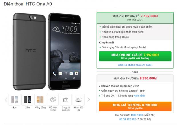 Hiện tại, HTC One A9 đang được bán với giá rất tốt chỉ 8,99 triệu đồng, đặc biệt mức giá còn hấp dẫn hơn khi mua online, chỉ còn 7,2 triệu đồng.