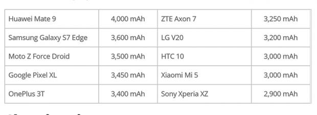 Kết quả bài kiểm tra về pin, smartphone flagship chiến thắng là Huawei Mate 9Kết quả bài test Huawei Mate 9 và ZTE Axon 7 giành chiến thắng trong cuộc đua này, Samsung Galaxy S7 Edge đứng cuối bảng. Thật bất ngờ khi ZTE Axon 7 chỉ có dung lượng pin là 3.250 mAh và có màn hình QHD lại vượt qua nhiều đối thủ nặng ký để đứng top đầu danh sách này.