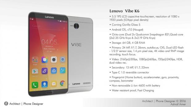 Concept Lenovo Vibe K6 được đăng tải trên website quen thuộc Concept-phones, có vẻ như đây là sự kết hợp giữa dòng Vibe và Lenovo K6. Sản phẩm này có màn hình 5.5 inch với viền cạnh rất hẹp trong khi mặt sau có phần giống với Lenovo K6, UMi Touch hay Meizu M3 Note.