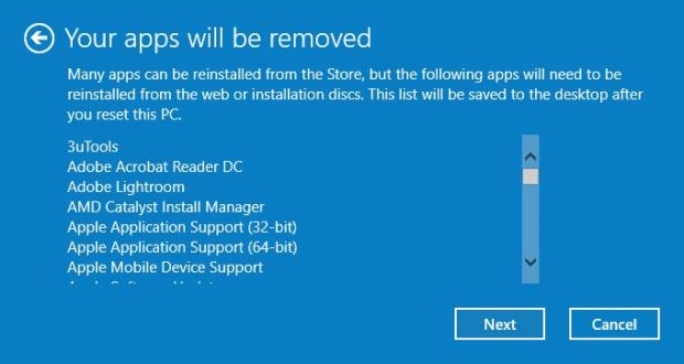 Bước 3: Một thông báo hiện lên và liệt kê toàn bộ danh sách những thứ sẽ được xóa ra khỏi máy tính, nếu chấp nhận bạn nhấn vào Next một lần nữa để bắt đầu quá trình làm mới máy tính.