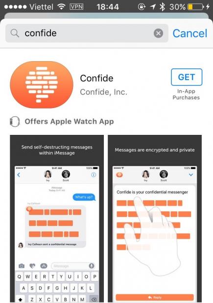 Khi muốn gửi tin nhắn tự hủy, bấm vào biểu tượng App Store sẽ thấy ứng dụng Confide hiển thị lên bấm chọn vào.