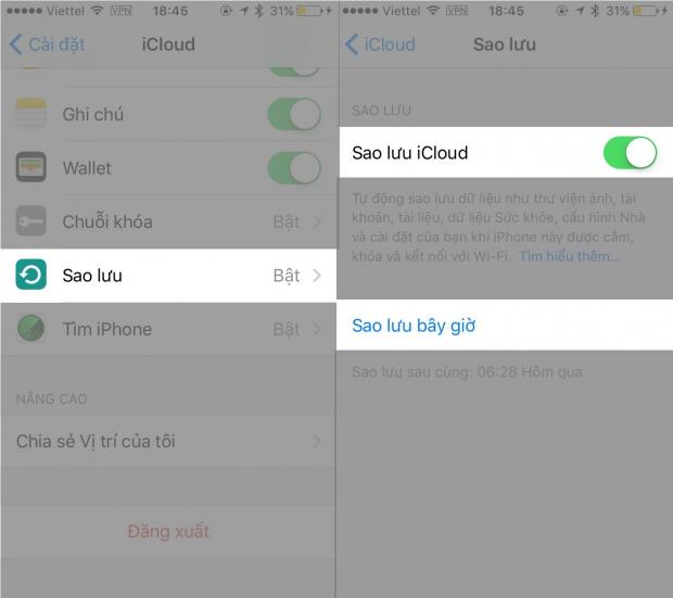 Sau đó tại giao diện iCloud, chọn Sao lưu (Backup) và nhấn vào Sao lưu bây giờ đợi đến khi quá trình hoàn thành.
