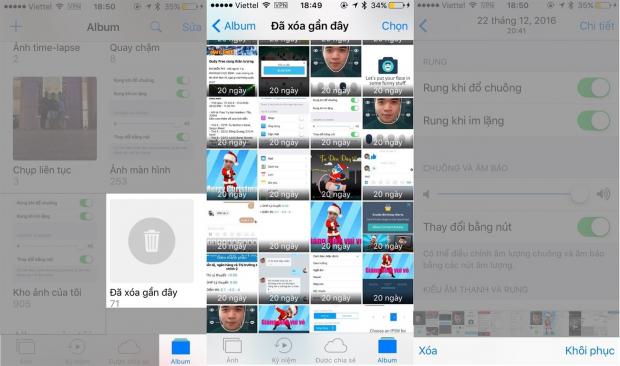 Chọn Album > Đã xóa gần đây. Tại đây hệ thống sẽ tự động lưu lại các hình ảnh bạn đã xóa, được phân bố theo ngày. Chọn tấm ảnh muốn khôi phục và Khôi phục.