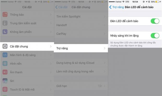Để kích hoạt tính năng này, bạn vào Cài đặt > Cài đặt chung > Trợ năng > Đèn LED cảnh báo.