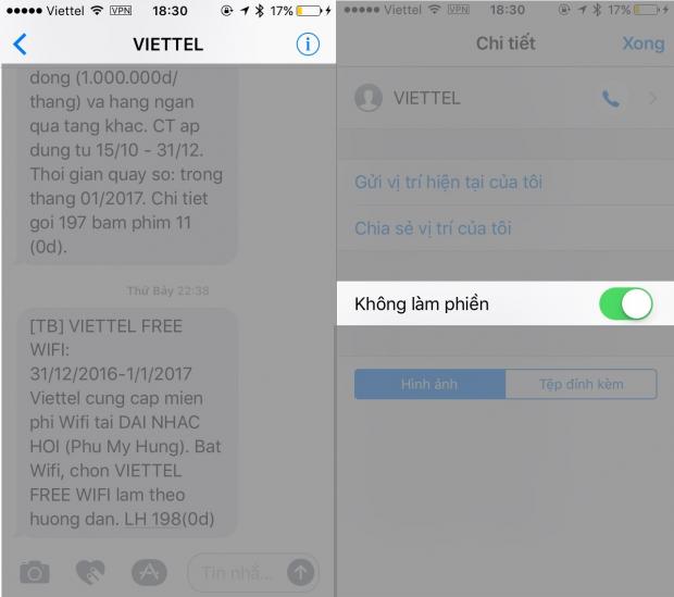 Vậy tại sao không bật im lặng chỉ với các tin nhắn Spam từ tổng đài? Để cài đặt chế độ này, bạn vào Tin nhắn > chọn mục tin nhắn bạn muốn cài đặt > chọn Chi tiết > chọn Bật Không làm phiền nhé.