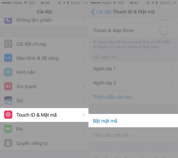 Để cài đặt dãy 6 số làm mật khẩu, bạn vào Cài đặt > Touch ID & Mật mã > Bật mật mã.